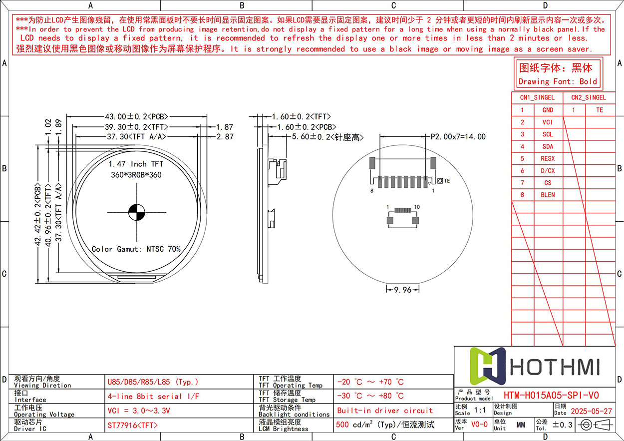 这款1.5英寸圆形TFT模块卓越的工业级可靠性令人瞩目:工作温度横跨-20℃至+70℃,存储温度更可耐受-30℃至+80℃严苛环境。高达500 cd/m2的典型亮度(恒流测试),确保强光环境下画面依然清晰锐利。模块特别优化动态显示性能,建议搭配黑色或动态屏保使用,避免固定图案长时间停留超过2分钟,有效预防图像残留,延长屏幕寿命。