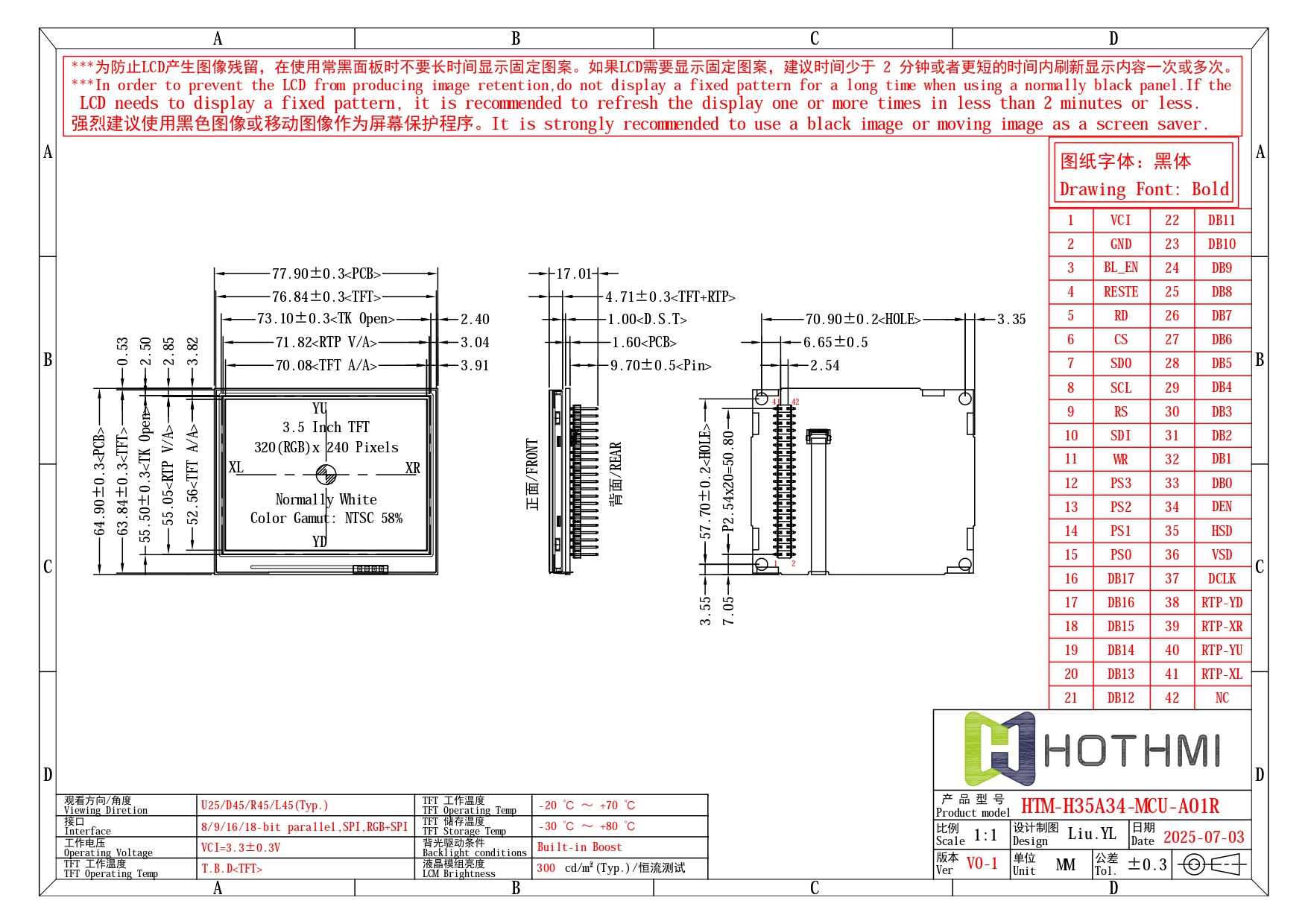 3.5寸TFT显示屏模块-320x480 MCU LCD-ILI9488控制器 HTM-H035A31-MCU-A01 TFT显示模组 320x480 57.25x96.5x6.2 3.5 3.5 50.2x74.5 IPS全视角 400cd/m2 MCU 防静电ESD 8KV -30~80℃ +3.3 V ILI9488