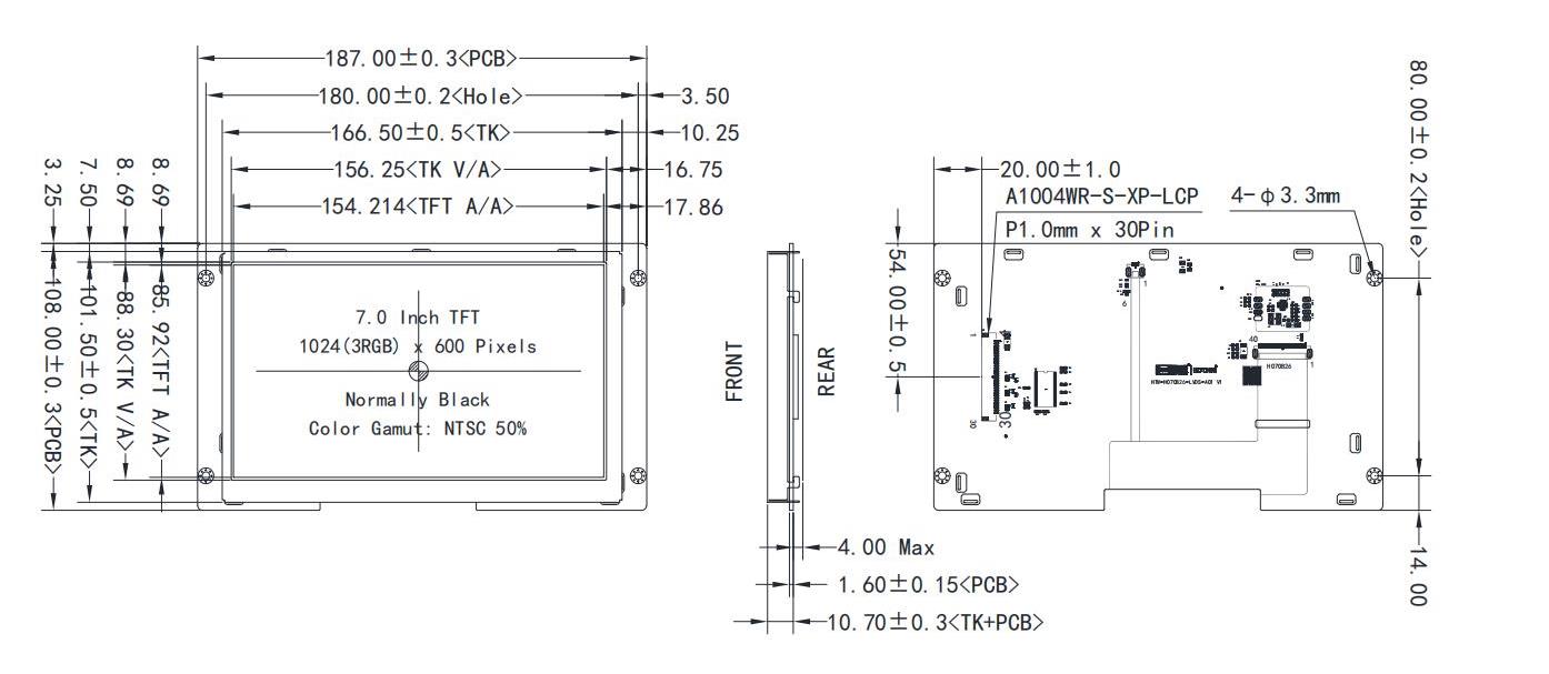 187.0x108.0x12.6 | 154.214x85.92 | 7.0 | IPS全视角 | 800cd/m2 | FPC-30pin | LVDS | 8KV 防静电 (ESD) | -20~70℃ | +3.3V |